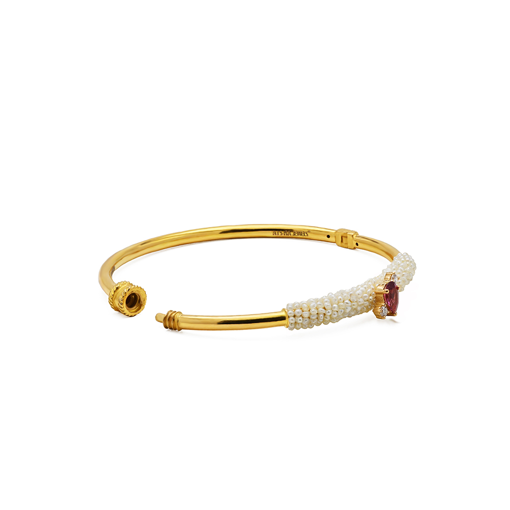 ذهب أصفر عيار 22 (8.275 جرام)، مرصع بالألماس درجة ڤي اس، اللون جي (0.07 قيراط)، تورمالين وردي (0.083 جرام)، ولؤلؤ بحريني طبيعي (0.881 جرام) تقريبًا.