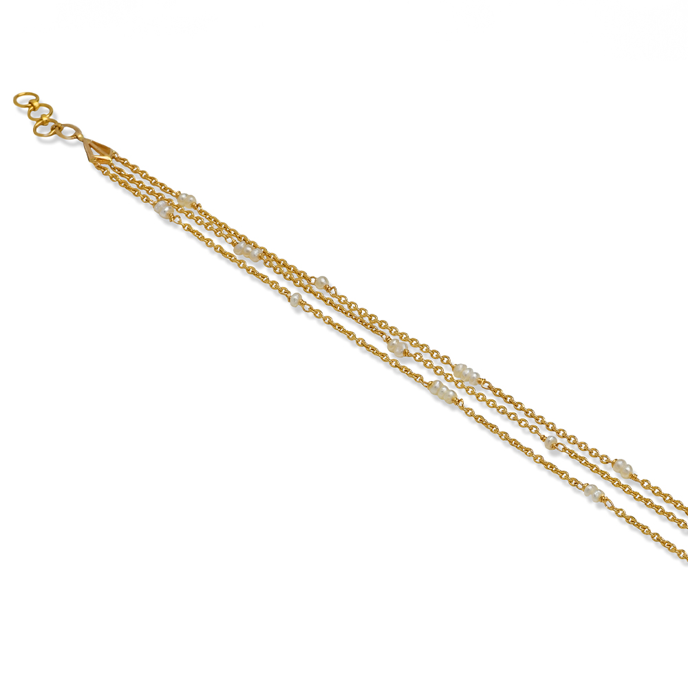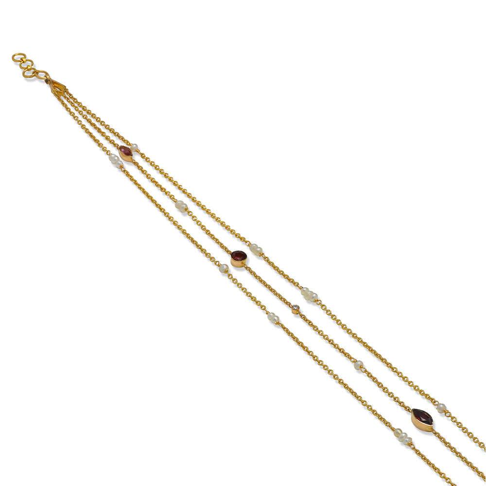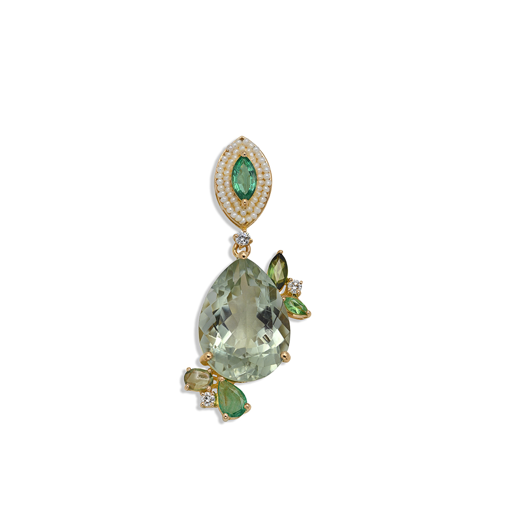 ذهب أصفر عيار 22 (5.076 جرام)، مرصع بالألماس درجة ڤي اس، اللون جي (0.104 قيراط)، الاحجار الكريمة (2.335 جرام)، ولؤلؤ بحريني طبيعي (0.079 جرام) تقريبًا.