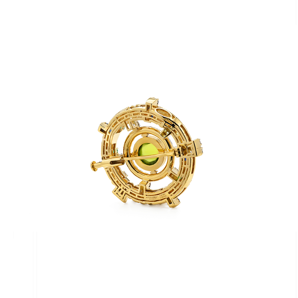 ذهب أصفر عيار 18 (21.856 جرام)، مرصع بالألماس درجة ڤي اس، اللون جي (1.14 قيراط)، والاحجار الكريمة (1.233 جرام) تقريبًا.